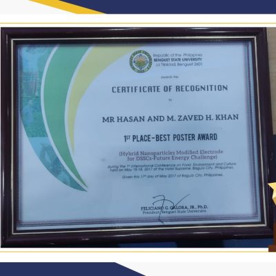 - 1st Place of Best Poster Award of Mr. Hasan and M. Zaved H. Khan